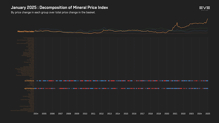 Both ore mining and gas harvesting volumes grew in January, increasing by 7.6% and 9.2%, respectively. In contrast, ice mining volume dropped by 25.4%, attributed to the conclusion of the Winter Nexus event and Volatile Ice Storms not being available for most of January.