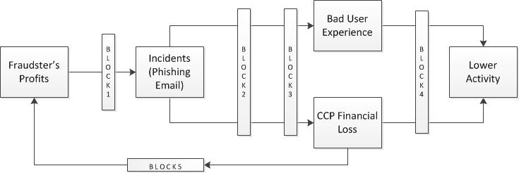 This is a flow diagram which mirrors a similar diagram created by Paypal and maps out the lifecycle of a phishing attack and its impact on the business and the business's customers: