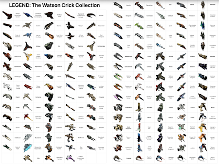 Far from the chaos, Watson Crick has been assembling a different kind of fleet. Brought to life with paint, patience and a steady hand, he finished giving each ship a new SKIN. If you were curious what was chosen, there's even a handy legend for the various hulls and paint jobs in the collection