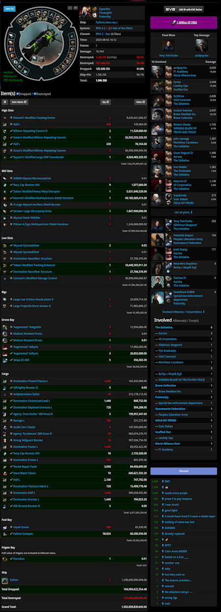 Congratulations are in order for the Tuskers Co., who emerged victorious for the second year in a row in Alliance Tournament XXI. See the AT wrap-up for all the juicy statistics. A total of 54 alliances participated in 140 matches for this year’s tournament. There were 711 kills worth an estimated total of 1.52 trillion ISK, with the most valuable flagship loss valued at 210.94 billion. And on the subject of expert marksmanship, congratulations are in order for the most valuable solo killmail – and commiserations for the most expensive ship loss.