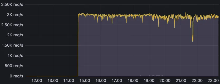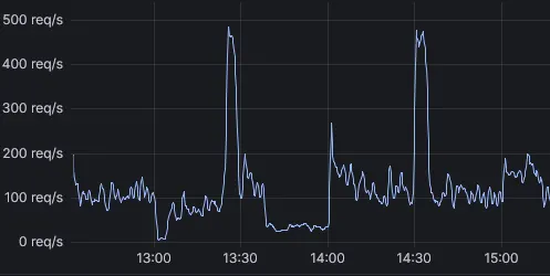 The more common issue is regular traffic spikes, especially on the hour and half-hour. Routes like /assets/ are frequently hit the hardest, with traffic spiking up to five times above normal. Scaling to meet these peaks puts unnecessary strain on the API Gateway, Monolith, and Quasar. There’s a limit to how far infrastructure can be stretched just to handle burst traffic. Smoothing those spikes is essential.