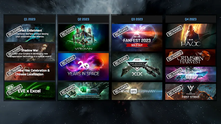 Nous sommes très impatients de partager ce que 2024 apportera, chaque développement à venir représentant une avancée dans notre effort constant pour faire d'EVE Online un univers toujours plus immersif, captivant et dynamique. Des profondeurs de l'espace de sécurité nulle jusqu'aux lignes de front du combat planétaire, chaque mise à jour et chaque expansion sont pensées pour vous. Notre feuille de route n'est que le début, et nous avons des événements exceptionnels prévus cette année, y compris le Jour des Capsuliers, la Moisson Pourpre, le Winter Nexus, et le plus grand Alliance Tournament jamais organisé, il y a donc beaucoup de raisons d'être enthousiaste.