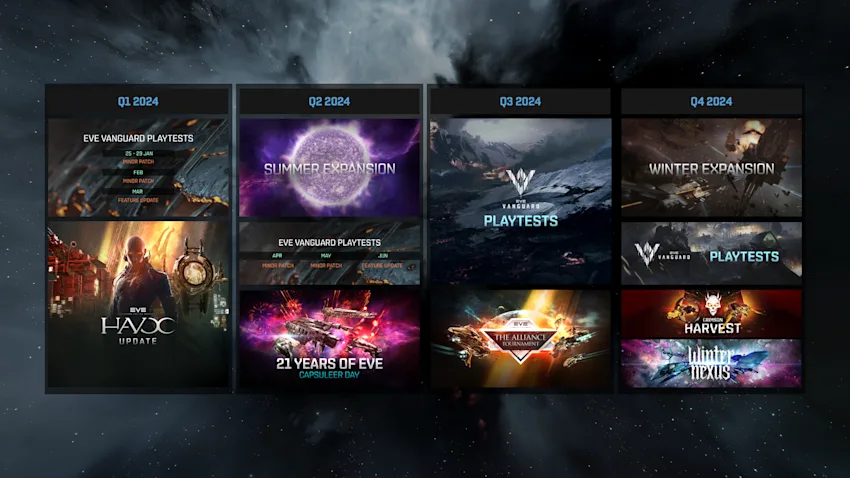 Ces thèmes soutiennent et stimulent notre vision créative, l'expérience de science-fiction ultime, et avec cette focalisation sur les conflits, l'identité et la communauté, les deux expansions prévues pour 2024 marqueront un changement d'orientation vers l'espace de sécurité nulle et augmenteront les riches opportunités offertes aux capsuliers. De plus, nous élargirons les possibilités d'expression personnelle grâce à l'évolution de SKINR pour la personnalisation des vaisseaux, nous renforcerons davantage les liens entre les joueurs à travers les corporations et les flottes, tout en continuant à développer EVE Vanguard en collaboration avec vous, la communauté.