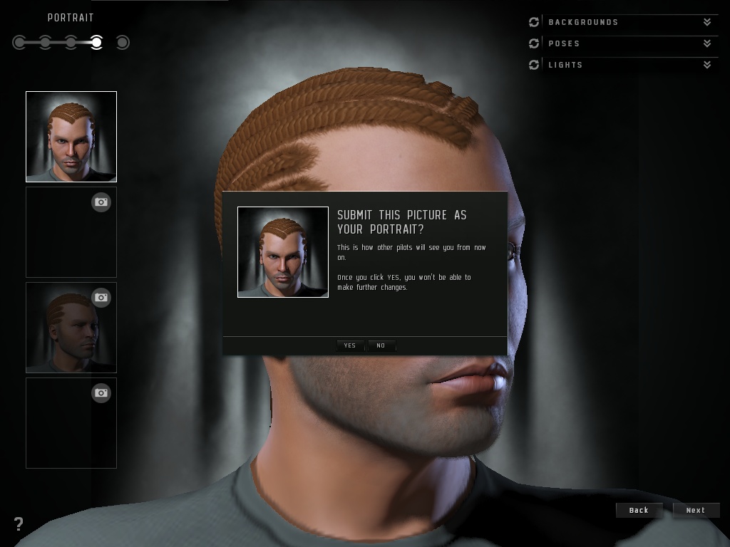 Change 2: When players click "Finalize" they will be presented with a dialogue box like the one below. The dialogue box shows the portrait snapshot that the player currently has selected. It makes clear that this is the portrait that will represent the character to other pilots in game and that once the player clicks "YES", no further changes will be possible. However, if a player clicks "NO" they will be returned to the portrait creator and can continue working on their portrait.