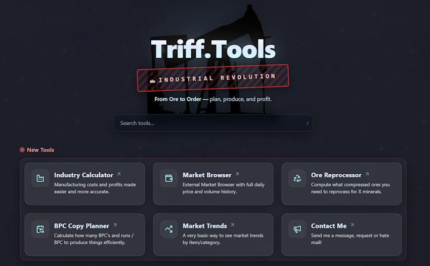 Triff Tools is a broad suite of tools to help with just about every aspect of mining, refining, research and production. Basically if it has something to do with industry you'll find a calculator, browser, appraiser or converter to help you with it. It has some handy wormhole tools as well! Triff Tools creator Triffnixxx has recently released a significant update for it and you can read what they had to say here.