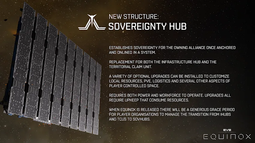 • The Sovereignty Hub is placed around the star in a system and is the central location for installing and managing sovereignty upgrades. Authorized capsuleers can interact with the Sovereignty Hub to allocate colony resources to installed upgrades.