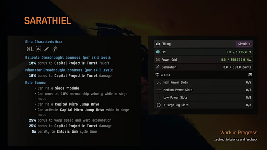 The Sarathiel, an Angel Cartel dreadnought, is a brutal addition to capital ship rosters. It features large bonuses to projectile weapon damage and falloff, allowing it to strike hard from across the battlefield. The Angel Cartel is known for designing ships with high mobility, and the Sarathiel is no exception. In addition to the usual warp speed bonus, it has a unique twist. While in siege mode, it has the ability to move and even use a capital micro jump drive.