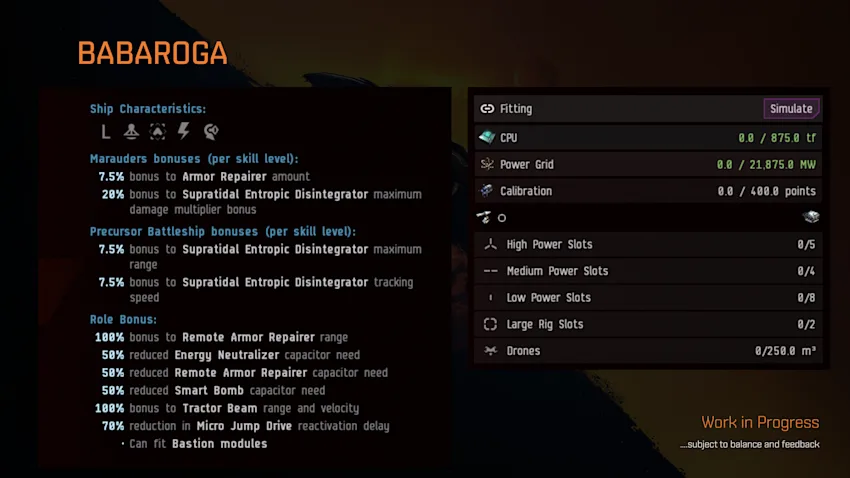 The Babaroga is the Triglavian answer to the empire marauders: ruthless, elegant, and terrifying. With boosted tracking, increased optimal range, and max spool bonuses, it delivers incredible disintegrator damage at a distance. Thanks to the ability to fit a bastion module for powerful offensive and defensive bonuses, the Babaroga is far more resilient than the Leshak, while also claiming the crown for peak potential subcapital ship DPS.