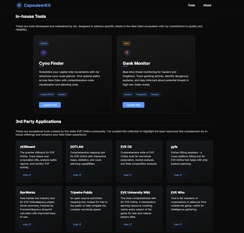 It serves as a hub for some of the community's day-to-day tools and external websites and is a great recommendation to anyone starting out who wants to get up to speed with some of the tricks of the trade. I used to keep a bookmark for each of these pages separately when I needed them, but now I have the CapsuleerKit!