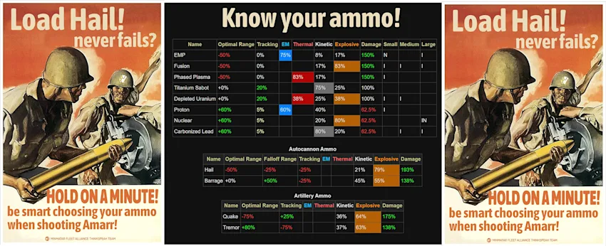 Or Minmatar Fleet goes back to basics of reminding us about different types of (projectile) ammo. Most things in the universe have particular strengths and weaknesses to varying types of damage, and understanding what type of damage to apply can make the difference in your target getting destroyed or surviving: