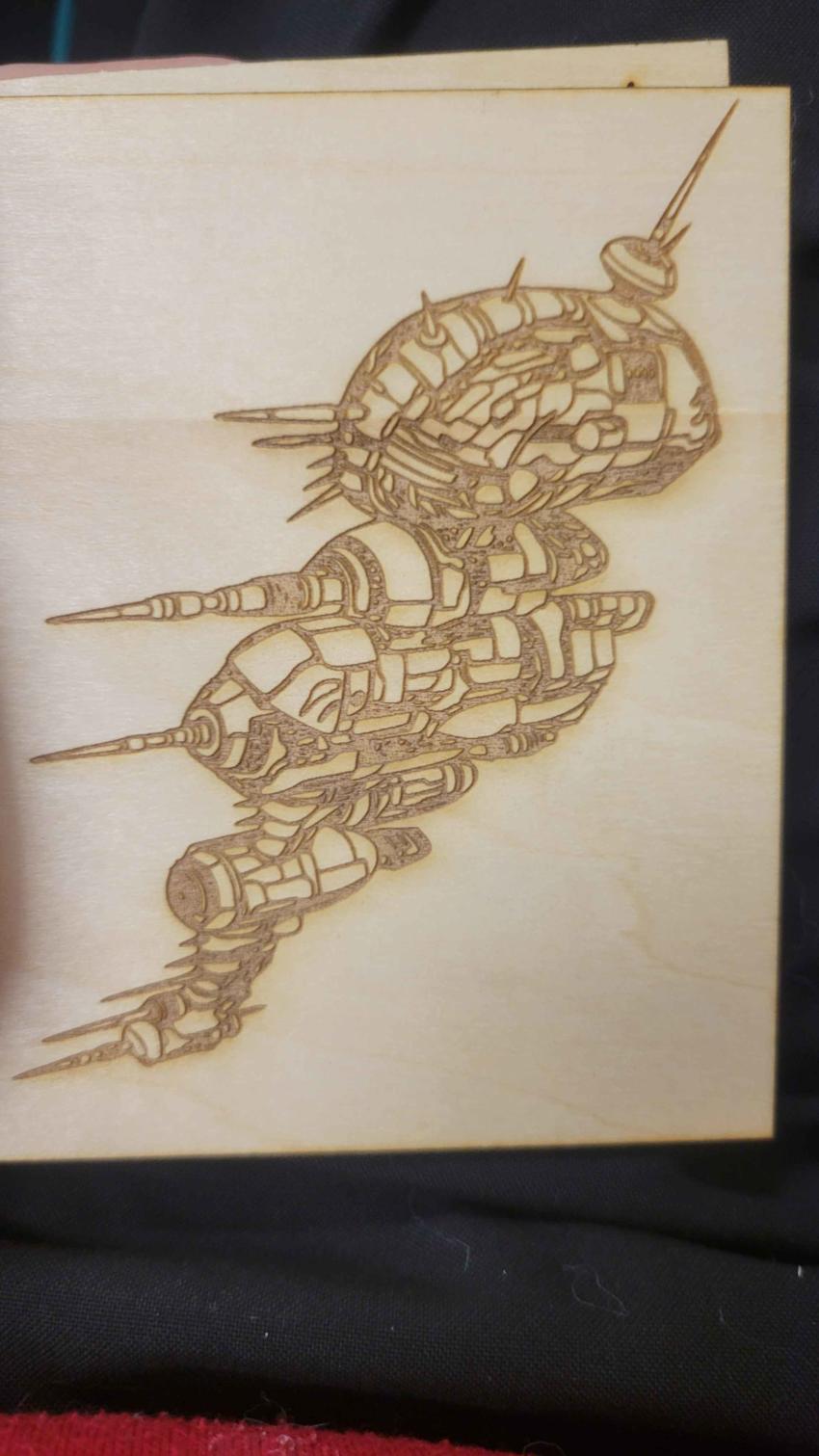 One of the other artists, Cpt Armarlio, does a lot of fantastic "Wireframe" type designs and drawings and Evifreyalp over on the EVE Discord in the #eve-art channel as well has been laser etching the designs into wood, which look incredible.
