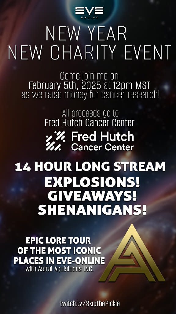 Streamer skipthepickle is planning a 14-hour charity stream to raise money for cancer research. It will include a lore tour of New Eden as well as giveways! It starts at 19:00 EVE Time (UTC) on Wednesday, 5 February. Tune in and make a donation if you can!