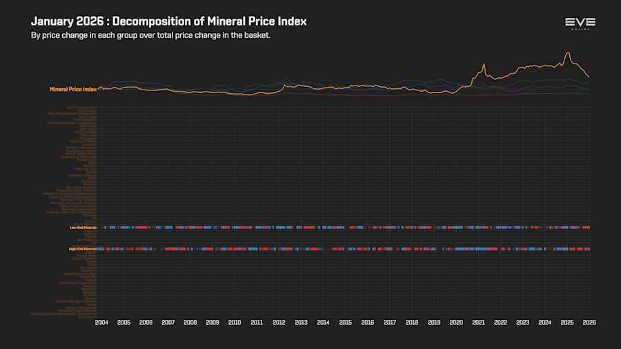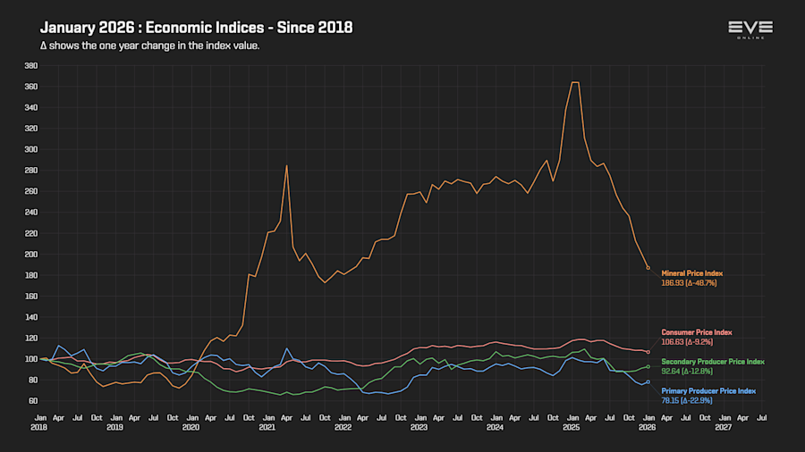 The Mineral Price Index continues to decline, with an approximate 50% decline over the last year.