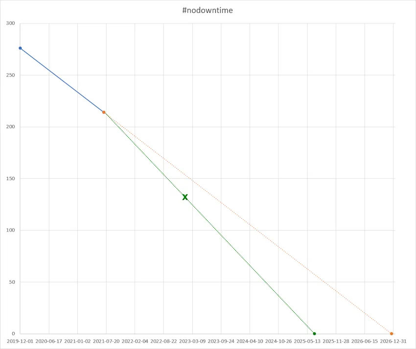 A side-note on the side-note is that in the that latest #nodowntime devblog, we noticed that “an auto reboot downtime of 3 minutes and 30-40 seconds is pretty normal these days“ – but in 2023, with all these improvements mentioned and more, it is 2 minutes and 5-15 seconds. Here's the very “scientific” #nodowntime progression graph from 2021 updated: