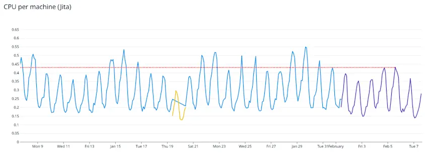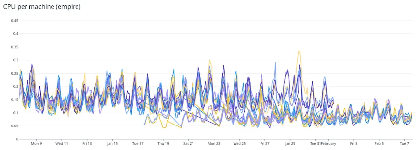 This graph shows the effect as the new Gold 6334 machines were swapped in and the old E5-2637 v3 machines were removed over a period of two weeks. This graph would also be indicative of the performance improvements in unexpected fleet fights.