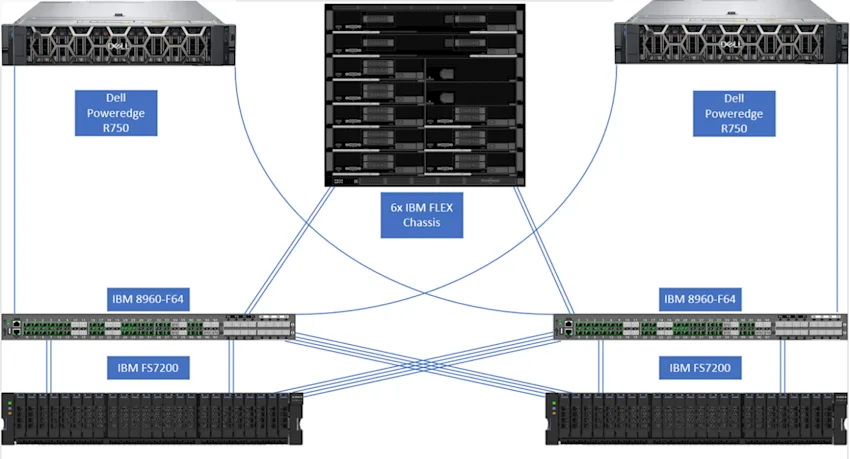 In 2021, the storage in our London datacenter and the game database machine (both its hardware and SQL Server version) were upgraded. The new storage is an IBM Flash System 7200 that uses NVMe-attached drives (there are no more spinning disks now; does that mean that the space hamsters are gone?) and the new database hardware is comprised of two Dell EMC PowerEdge R750 machines (primary/standby pair), each one a dual-CPU Intel Gold 6346, each CPU with 16 cores (hexakaideca), with 4 TB of memory. The setup is fully redundant and looks like this: