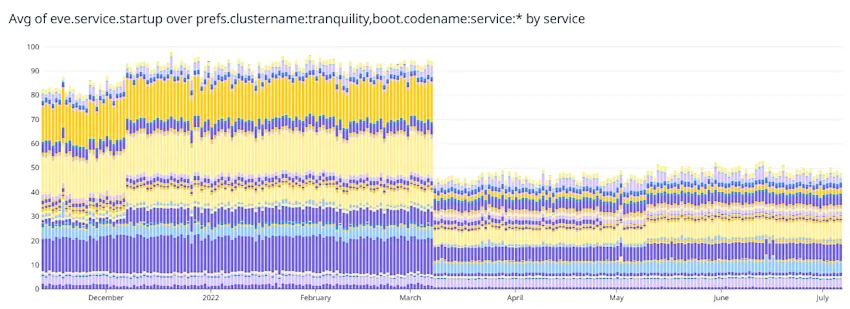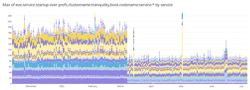After moving to the new SAN, the new database hardware, and SQL Server 2019 in October 2021, it was time to look at the few remaining startup issues. These were eventually solved with software changes. During startups the average service startup time across all the nodes for each service did not tell the entire story, since the average was skewed by a few random nodes each time taking a long time. The head node in the cluster orchestrating the startup had to wait for the last node at each step, so the maximum service startup across the nodes is what mattered. This was traced to random slow responses from the database where lists of values were being converted to ordered tables that were unkeyed heaps. Instead, a set of conversions from lists of values to keyed tables were created and then a large set of stored procedures were tested to see which method worked better. The first batch of fixes was deployed in March 2022 and improved the startup significantly. The maximum was drastically reduced: