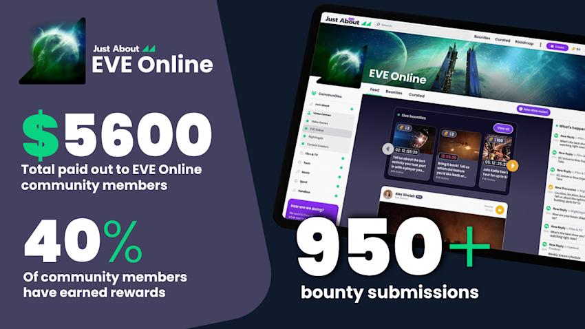 We'd like to give a shout-out to our partner Just About and give you an update on their bounty program that you can take part in! Capsuleers have been busy creating content, entering more than 950 submisssions so far, earning $5600 all together.