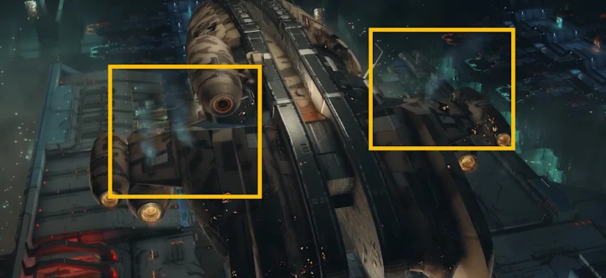 Not only do Smart-Light-Sets lay the groundwork for a new standard in authoring EVE spaceship VFX. Thanks to CCP Hank, part of their foundation is also the basis for the next generation of our VFX propagation tool. The previous generation of this tool is already in use in cinematic experiences, such as the ship boarding sequence introduced last year (see: gas jet emissions across ship surfaces as the ships spool up and down during takeoff and landing in Upwell hangars, and a dozen more implementations around New Eden).