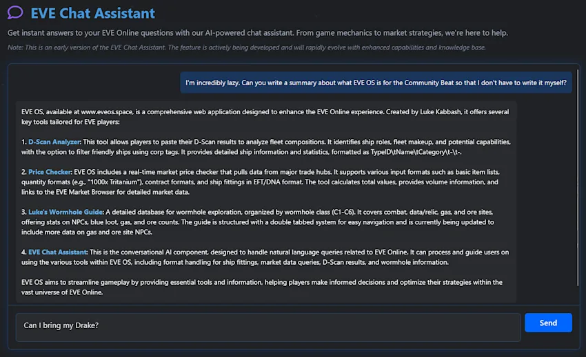 EVE OS includes what we believe is the first third-party AI-powered chatbot specifically trained to answer questions about EVE Online, so rather than write about it myself I asked the chatbot to do that for me. You can see here what it says: