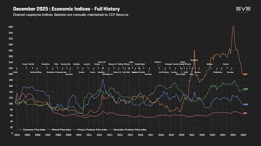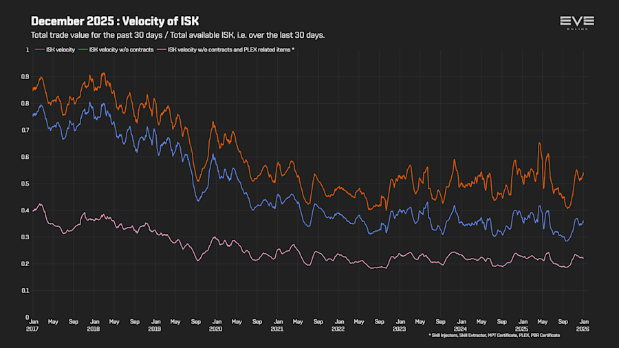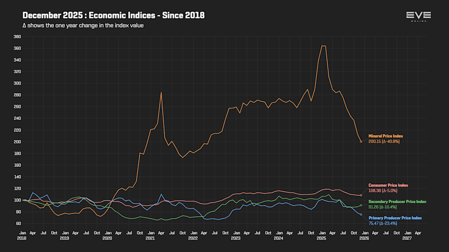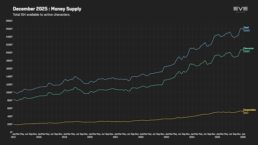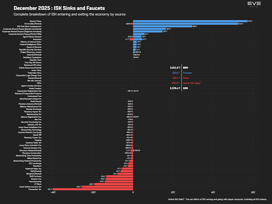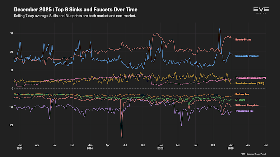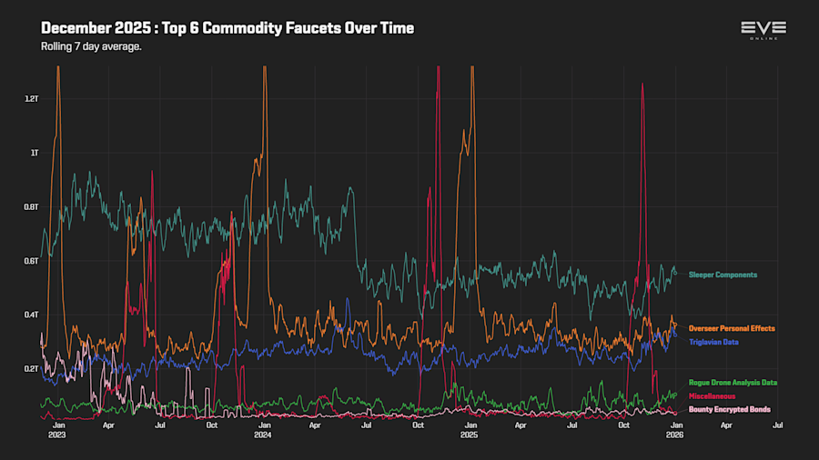 • Bounty Prizes ISK faucet has stabilized over December, while the Commodities ISK faucet has seen a ~20% growth.
